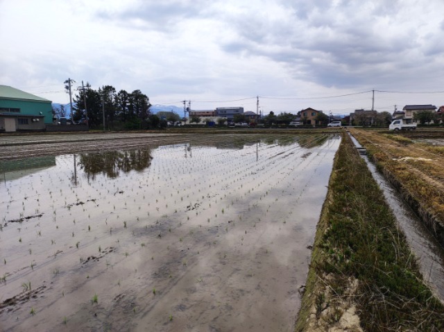 植え終わった田んぼです。植え終わったらすぐに水を入いれます。