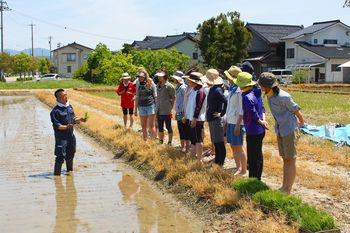 今回は、毎年大好評活動中で年々その規模を拡大している、石川県の伝統食・発酵食品を学ぶグループ、その名も「発酵食大学」のみなさんが当社にお越しになり、田植体験をされていきました。