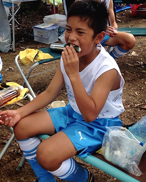 試合の前の気合いのかぶりつき! 健康的な肌とおにぎりがよく似合います。 男らしさあふれる写真で、3位入賞です。
